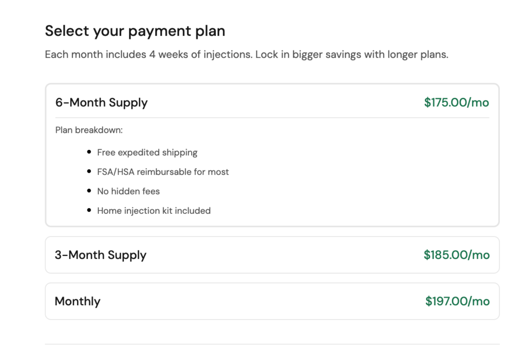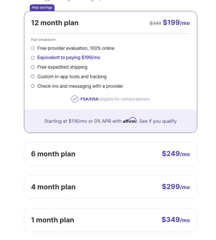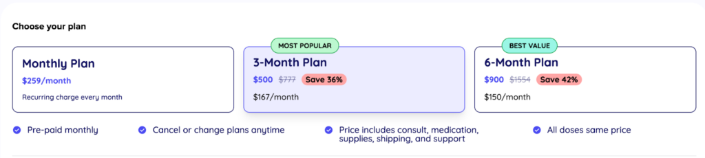 The draw here is price. Their 3-month plan costs $149/mo, the cheapest we found. And unlike competitors that charge more as your dose increases, MyStart offers a price-lock guarantee (your rate stays the same for as long as you’re enrolled).