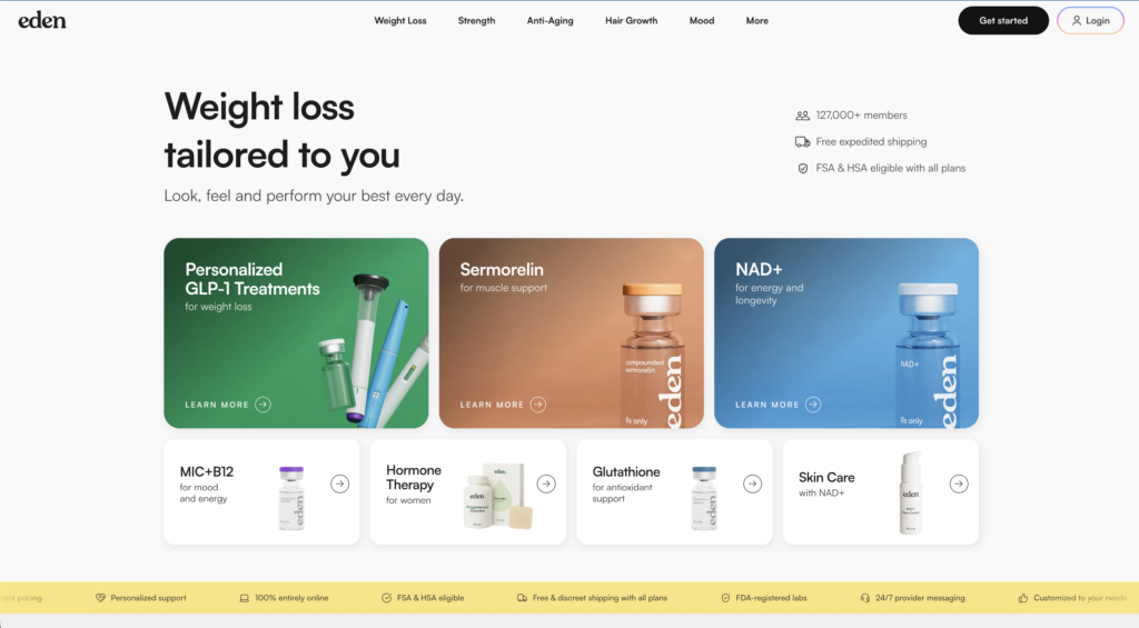 Eden gives you more medication choices than almost anyone else in this space. Compounded semaglutide (injectable and oral drops), compounded tirzepatide, GLP-1 gummies, brand-name Ozempic, Wegovy, Mounjaro, Zepbound, and even a $49/mo custom weight loss kit that combines metformin, naltrexone, and a few other ingredients. Most providers on this list only do compounded. Eden lets you go brand-name too, if that’s what you or your provider decide makes sense.