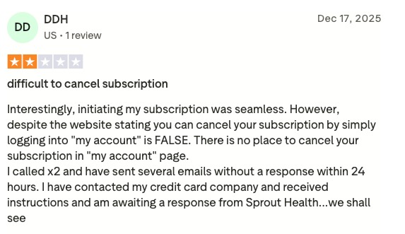 One of the biggest disadvantages of Sprout is its customer reviews. They have a 2.5-star review on TrustPilot. Most of the of which state that they have poor customer service, and raising the concern if medical professionals are actually reviewing the quiz information.